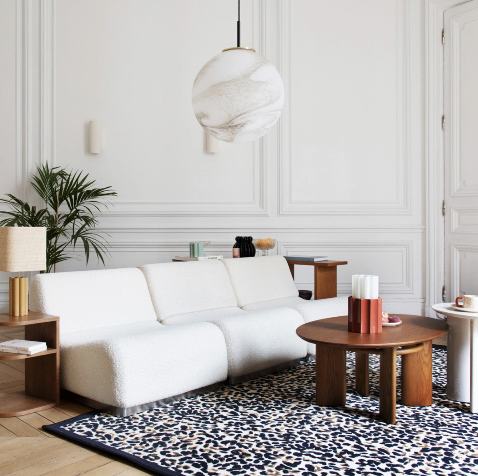Votre appartement rive droite est-il assez edgy ? Plutôt que de créer un « mur d’accent » à la couleur pourrie, pensez Yodelice et investissez dans ce tapis en polyamide (berk, dommage) au motif léopard, qui n’aurait pas déplu à Madeleine Castaing, la décoratrice d’intérieur qui en mettait partout, marié au bleu fétiche qui ornait ses rideaux et méridiennes.