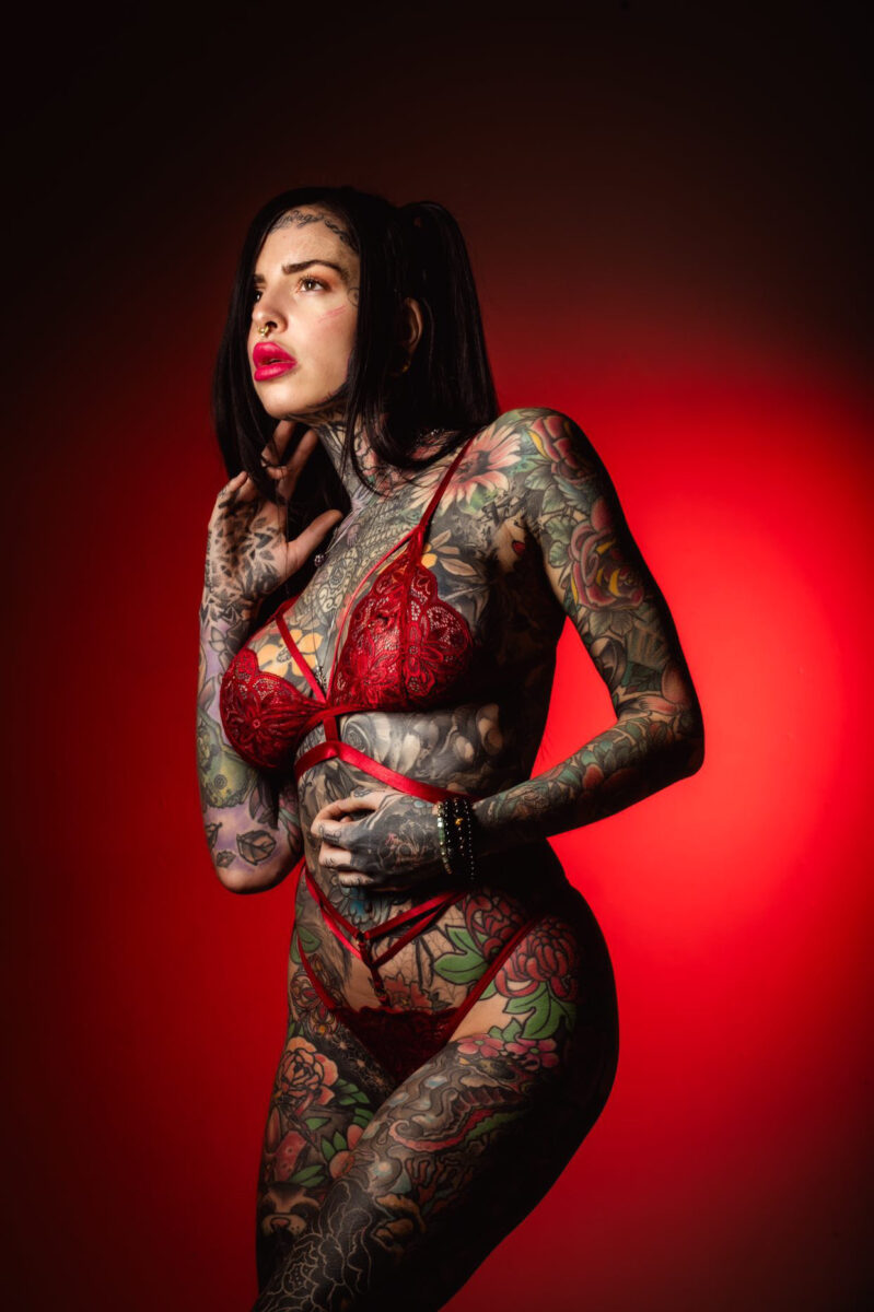 J’ai été repérée par des photographes et des agences sur Internet. À l’époque c’était Facebook. J’étais l’une des premières mannequins tatouées de France dans les années 2010. Je ne dirais pas que je fais du contenu érotique, plutôt du contenu sensuel, car j’ai l’art au corps… Mon corps est avant tout une toile d’expression. Chaque tatouage raconte une histoire, reflète une émotion ou une expérience vécue. Je veux capturer la beauté de ces récits à travers des poses artistiques et des jeux de lumière. Mon objectif est de transmettre des sentiments, de provoquer des réflexions, et d’inspirer d’autres à voir leur propre corps comme un chef-d’œuvre. Le glamour, pour moi, ne se limite pas à la séduction physique, mais englobe également une certaine force, une confiance en soi et une affirmation de sa propre identité. Je souhaite que chaque image soit une célébration de la beauté sous toutes ses formes, un hommage à la diversité et à la singularité de chacun. C’est cette vision qui me pousse à explorer davantage le monde de la mode et de la photographie, en cherchant toujours à montrer l’authenticité et la profondeur des émotions.